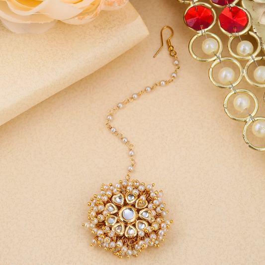 Shoshaa presents a beautiful handcrafted gold plated kundan work Maangtika embellished with kundan & beads....