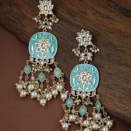 Shoshaa presents a beautiful handcrafted gold plated pair of drop earrings embellished with kundan, beads...