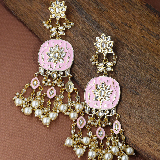 Shoshaa presents a beautiful handcrafted gold plated pair of drop earrings in powder pink color...
