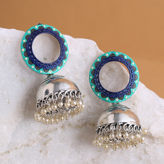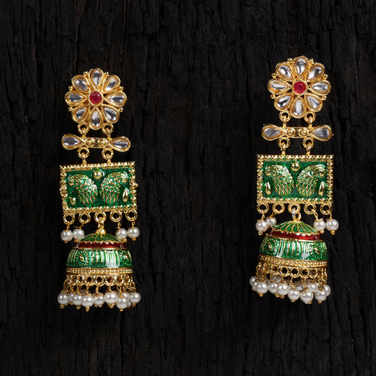 Shoshaa presents a beautiful handcrafted gold plated pair of jhumki earrings embellished with kundan, beads...
