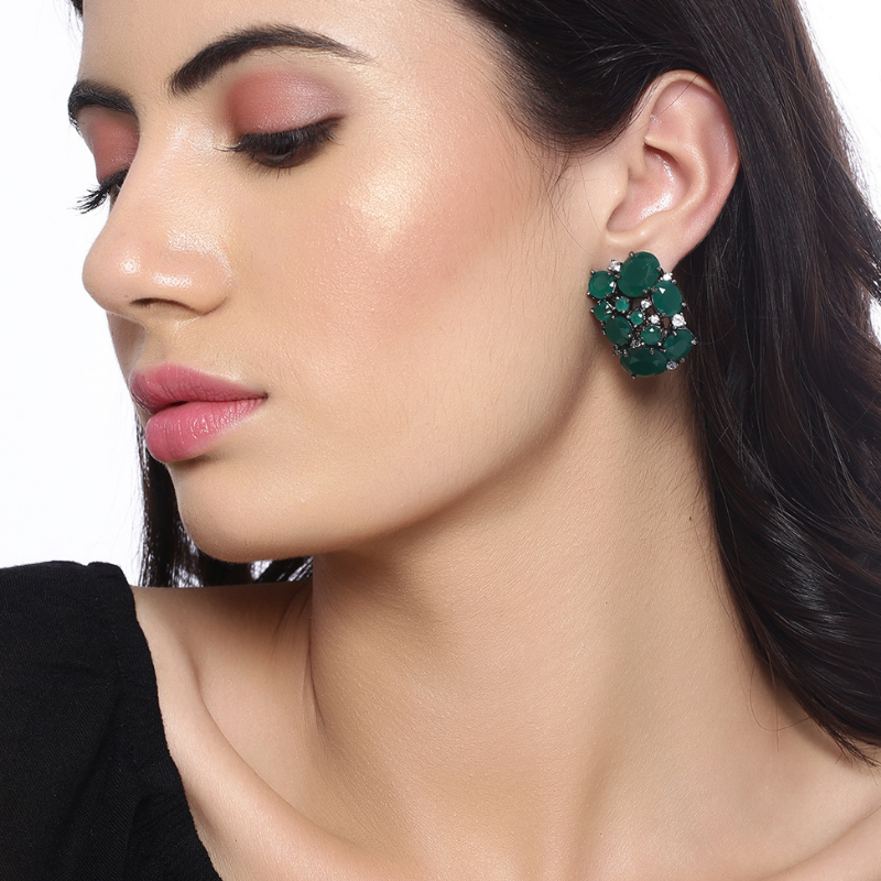 Shoshaa presents a beautiful handcrafted silver plated pair of stud earrings embellished with AD stones in green emerald stones. This earring gives you the beautiful smart look that makes everyone heads turn on you. Its a must have addition to your collection & is perfect for everyday wear. This trendy earring from Shoshaa will enhance your look with all outfits and it never goes out of style. This piece gives you the elegant look that makes everyone heads turn on you. The earring is secured with a post-and-back closure. SHOSHAA supports MAKE IN INDIA. Our jewellery is designed and made in India supporting hundreds of local Indian artisans.