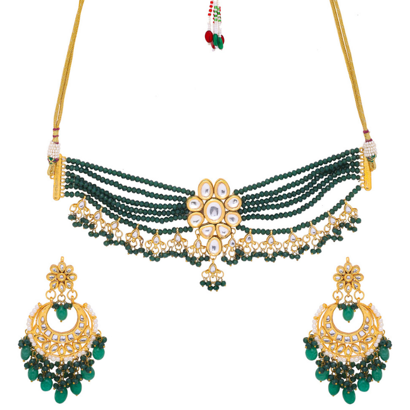 Green Gold-Plated Kundan-Studded Beaded Choker